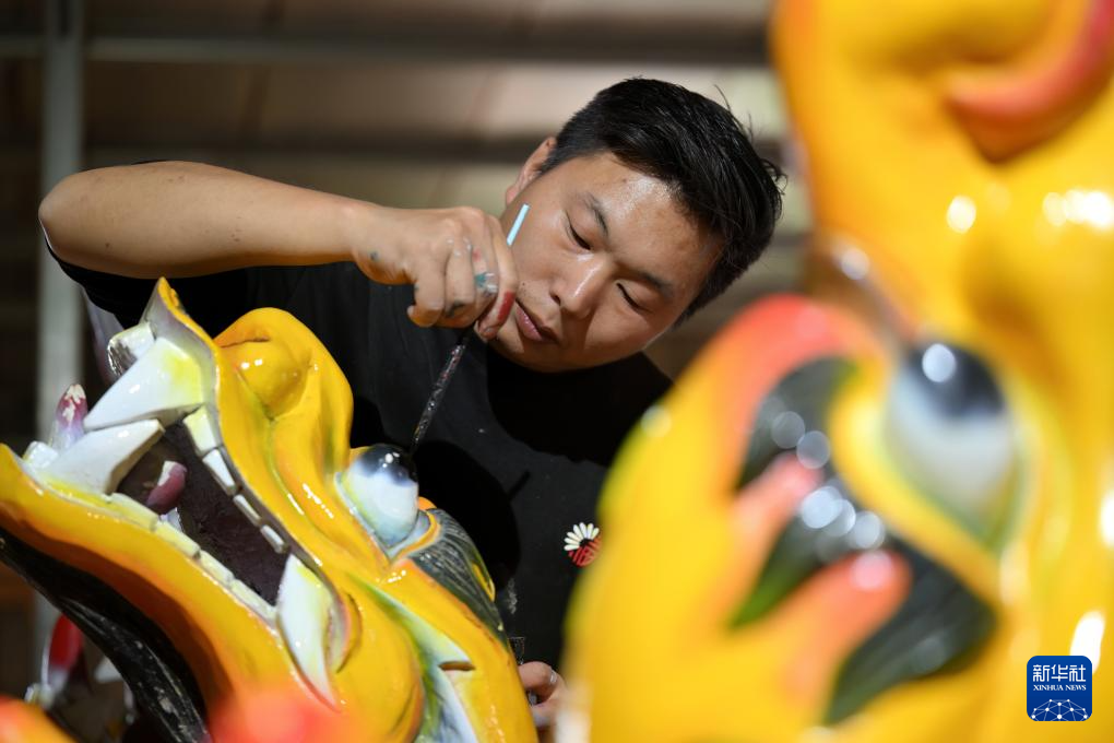 6月3日,工人在給一顆新龍頭上色。龍舟龍頭的制作最為復(fù)雜,需用幾十把不同的修光刀進(jìn)行加工,再進(jìn)行切割、噴漆、上色等步驟。新華社記者魏培全攝
