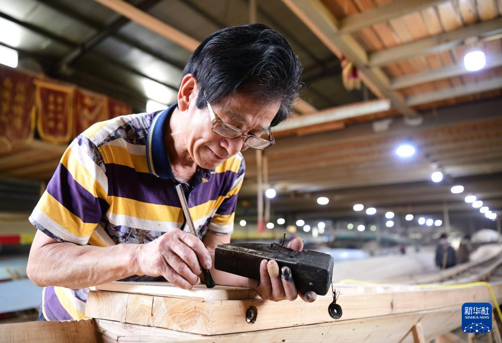 6月3日,在“龍舟世家”方忠雄龍舟廠,龍舟制造師傅在使用墨斗給龍舟打樣。新華社記者魏培全攝