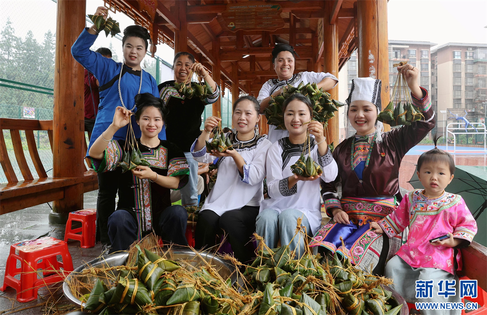 5月28日,市民在貴州省黔東南苗族侗族自治州榕江縣車民街道陽光社區(qū)展示她們包的粽子。新華網(wǎng)發(fā)(李長華 攝)