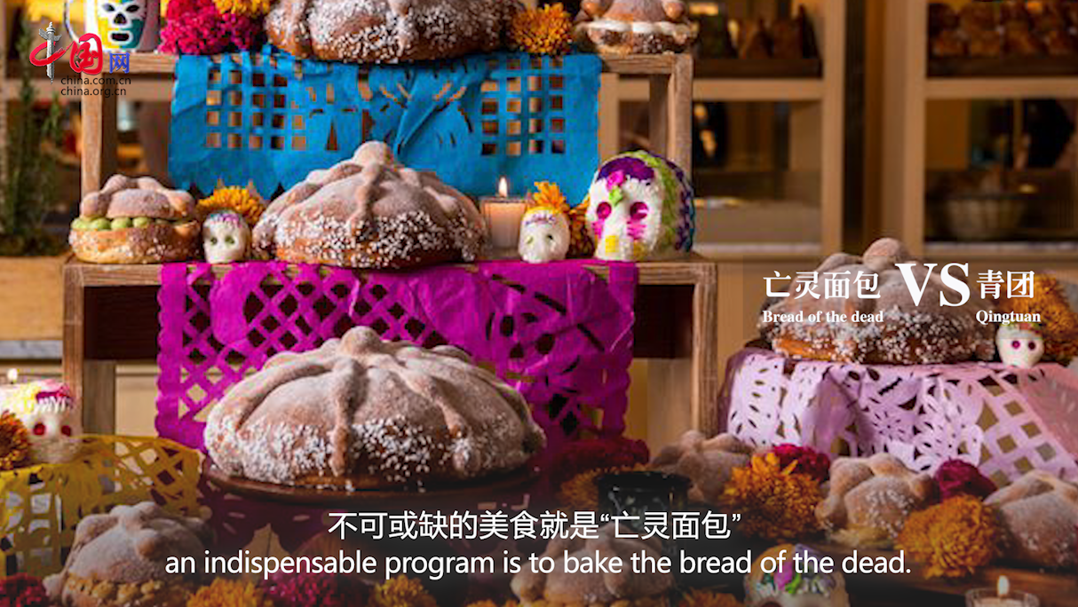 而在中國人看來,骷髏多少有點(diǎn)兒“嚇人”。中國清明節(jié)的傳統(tǒng)美食是“青團(tuán)”,采用青艾汁液拌進(jìn)糯米粉里,包裹豆沙餡而成。青團(tuán)寓意著團(tuán)圓,也是為了紀(jì)念先人,表達(dá)思念。