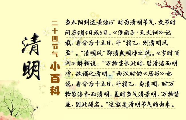 節(jié)選自《二十四節(jié)氣志》/宋英杰 4月5日前后為清明節(jié)氣,氣清景明之意,正是鳥語花香的盛春時節(jié)?!把匀f物去故而從新,莫不鮮明之謂也?!薄叭f物生長此時,皆清凈明潔,故謂之清明。”清明之名,便表征了這一時節(jié)的天氣是清新、明媚、和暖的。