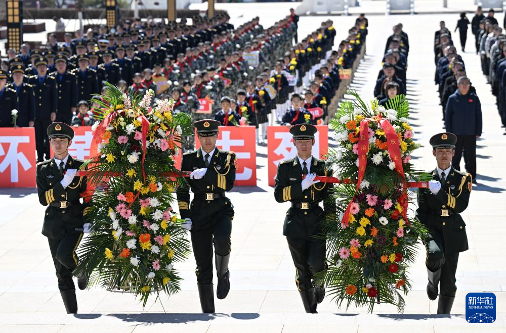 4月2日,儀仗隊員在內蒙古呼和浩特市大青山紅色文化公園向人民英雄紀念碑敬獻花籃。