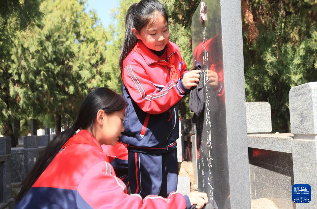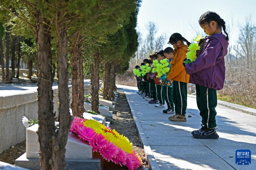 4月2日,河南省濟源市太行路學校學生在烈士陵園向革命先烈敬獻鮮花。