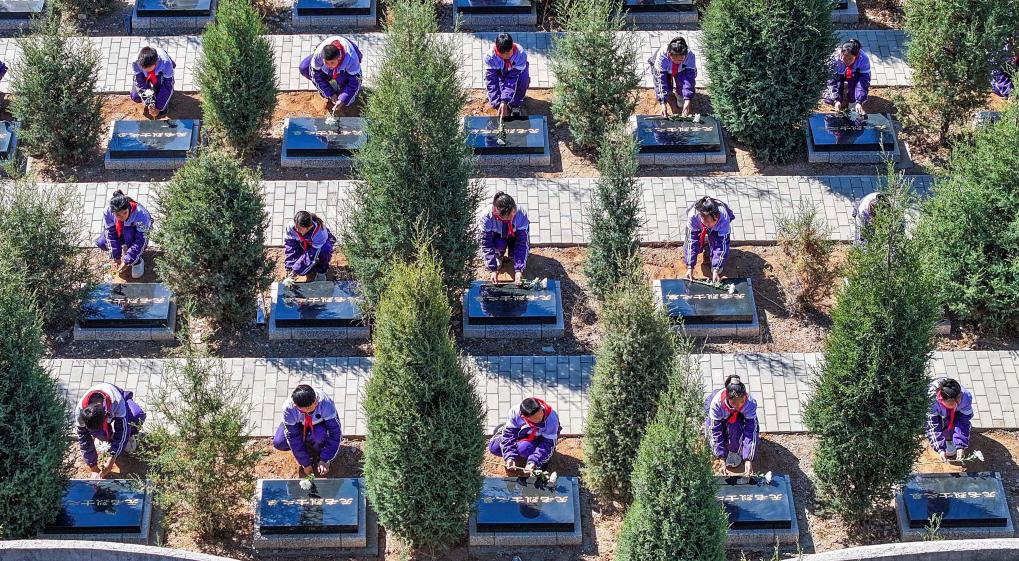 4月2日,河北省遵化市地北頭鎮(zhèn)學生在魯家峪烈士陵園向無名烈士獻花(無人機照片)。