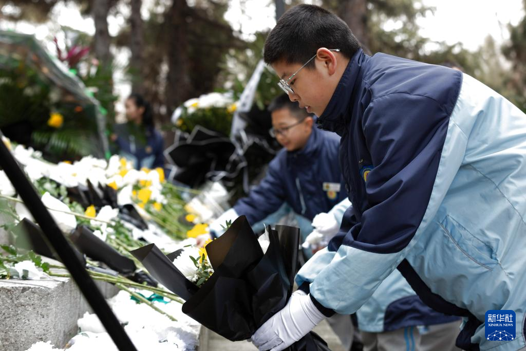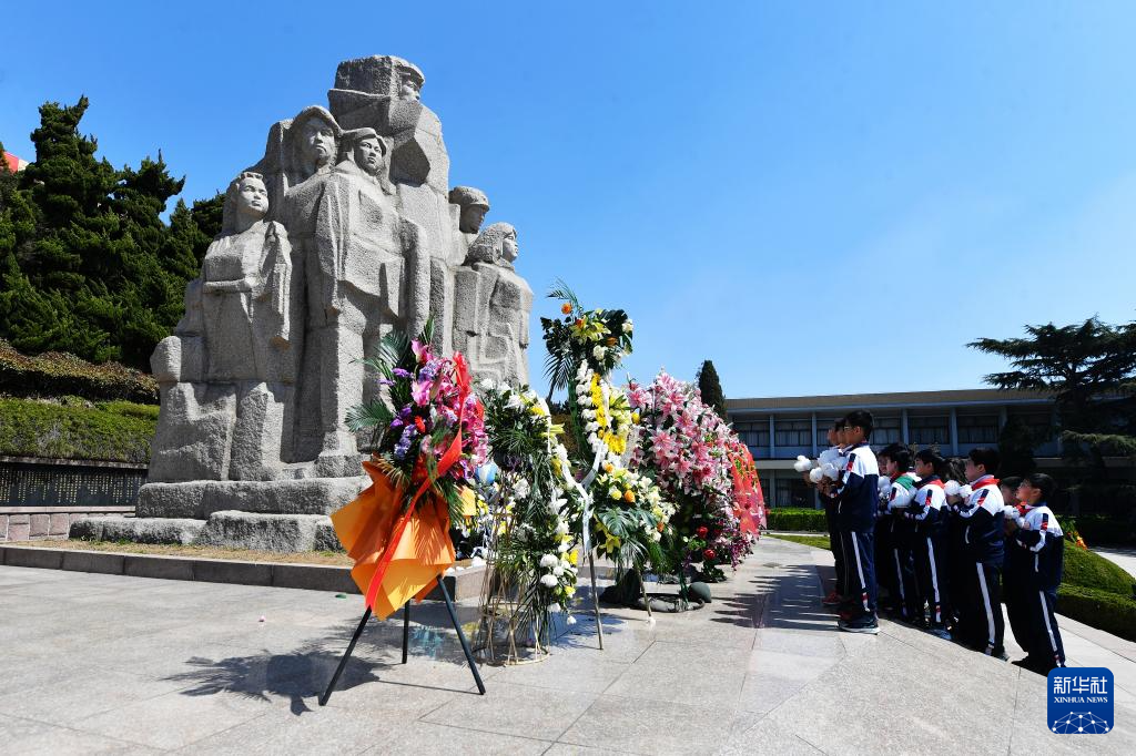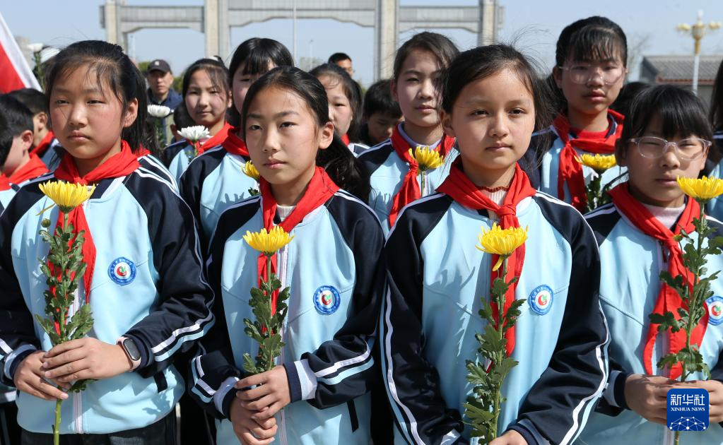 4月2日,學生在山東省滕州市烈士陵園向烈士敬獻鮮花。
