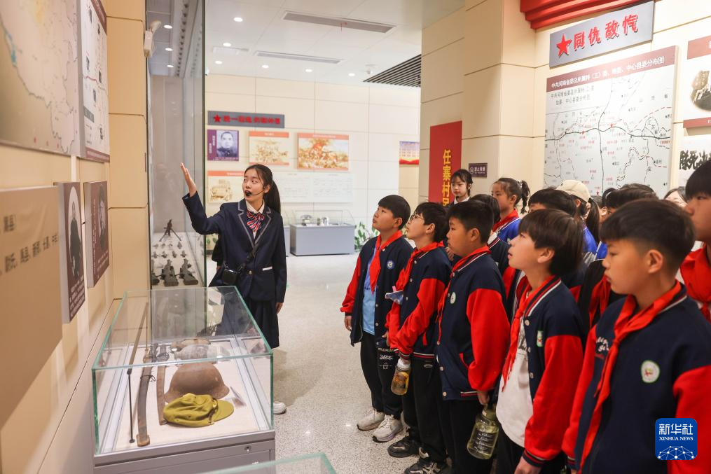 4月2日,講解員在河南省平頂山市寶豐革命紀念館為學生講述抗戰(zhàn)歷史。