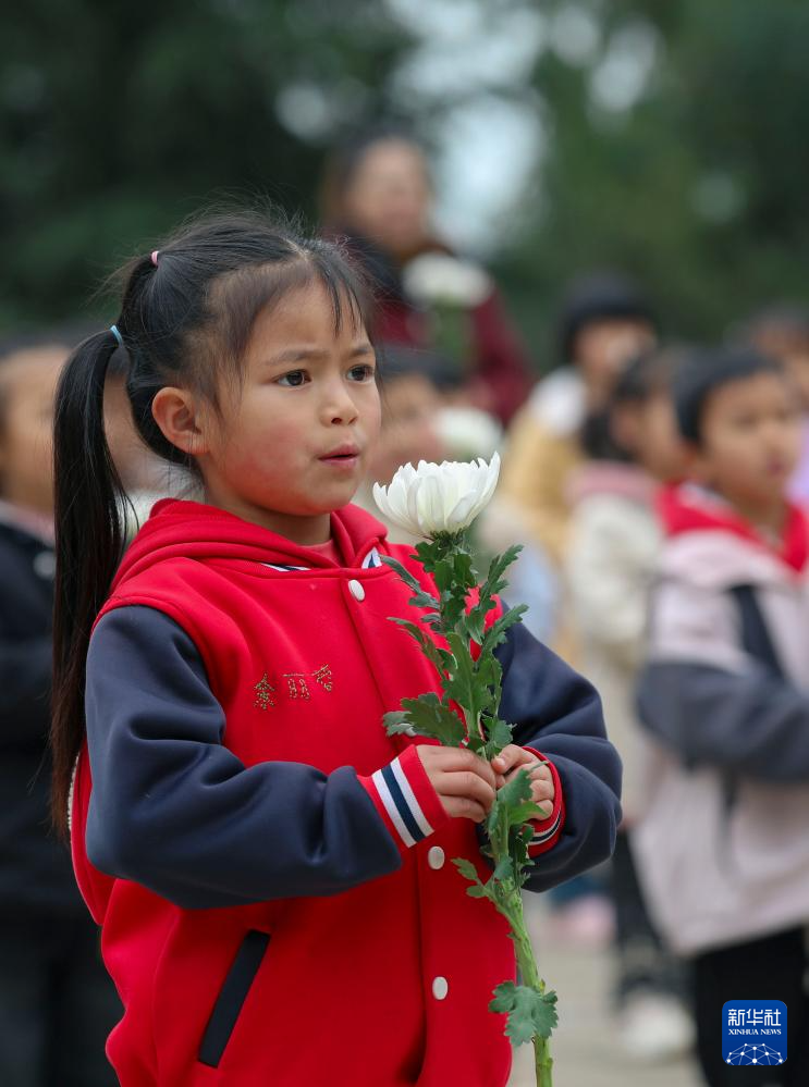 4月2日,小朋友在云南省曲靖市陸良縣青山烈士陵園向革命烈士紀念碑敬獻鮮花。