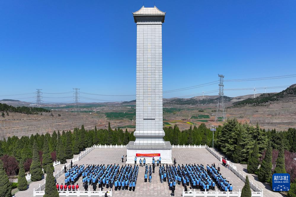 4月2日,學生在山東省滕州市烈士陵園緬懷先烈(無人機照片)。