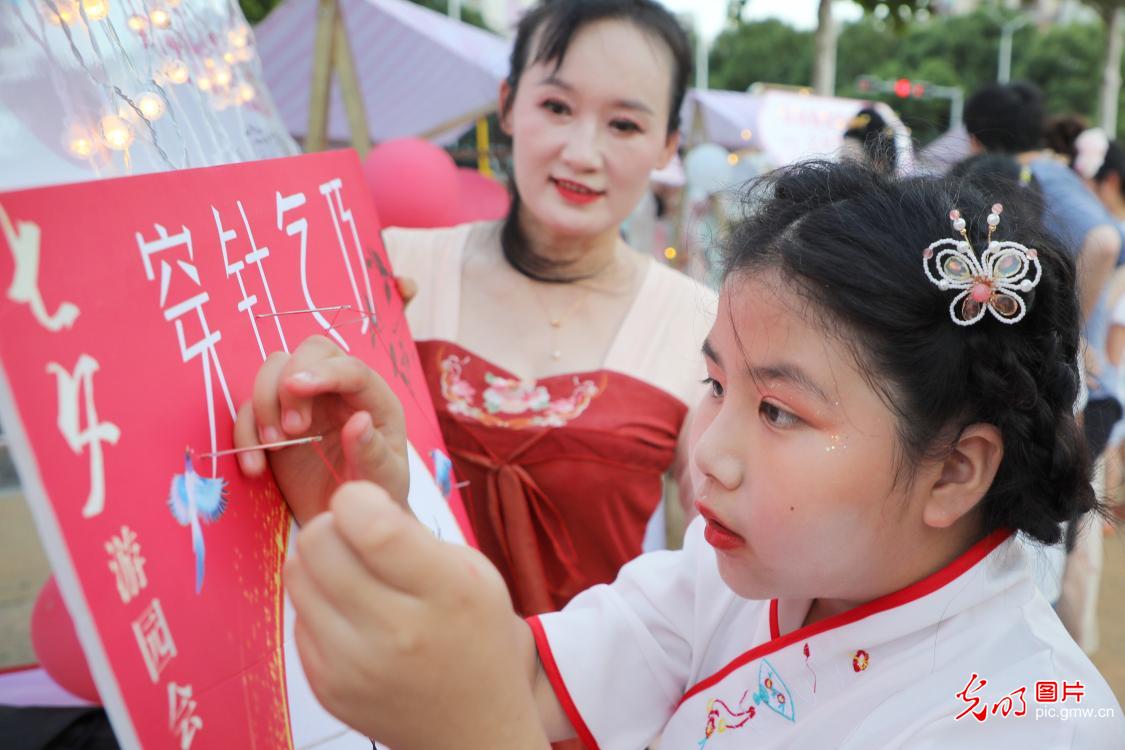 2025年8月20日傍晚,在安徽省六安市金安區(qū)東市街道開展的“七夕”游園會上,志愿者在帶領(lǐng)市民和小朋友手工制作香囊。當(dāng)日,六安市金安區(qū)東市街道在轄區(qū)金水灣體育公園開展“睦鄰東市·‘河’你共此夕”主題七夕游園會活動。通過漆扇繪制、香囊制作、穿針乞巧等民俗體驗,吸引市民參與傳統(tǒng)文化互動,既傳承節(jié)日文化內(nèi)涵,又以文化活動為紐帶促進鄰里交流,營造文明和諧社區(qū)氛圍,提升群眾獲得感和幸福感。(田凱平攝/光明圖片)