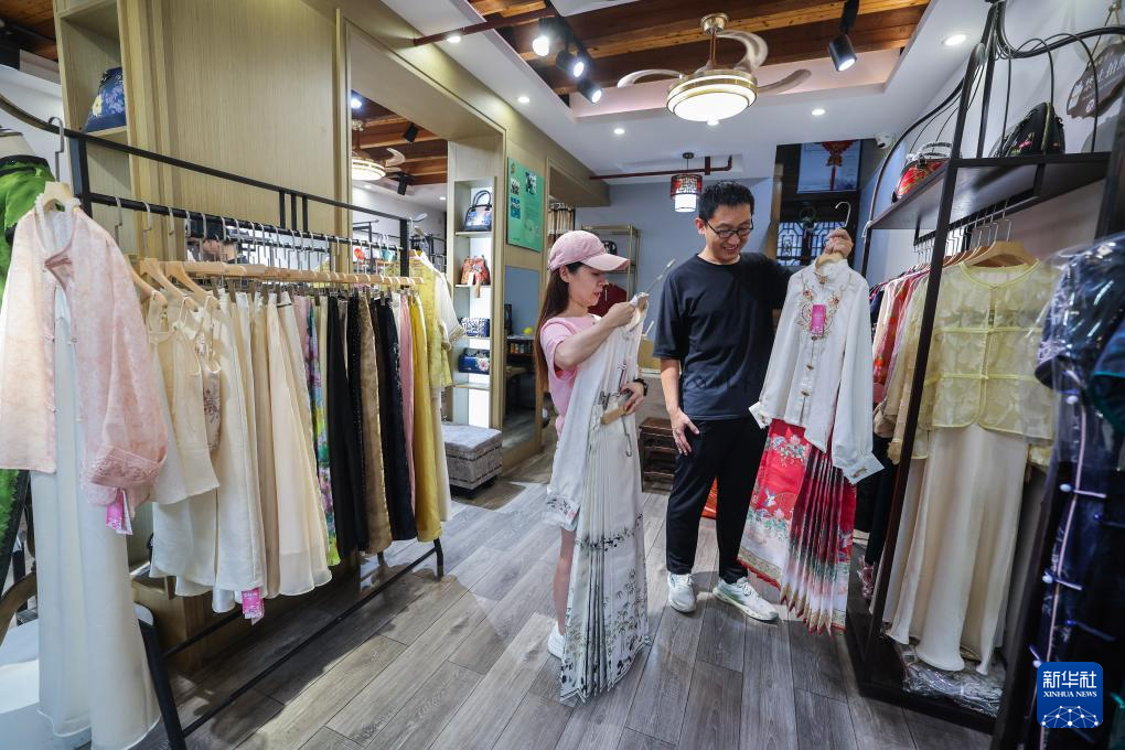 8月26日,游客在嘉興市南湖區(qū)月河歷史街區(qū)的一家店里挑選傳統(tǒng)服飾。新華社記者 徐昱 攝