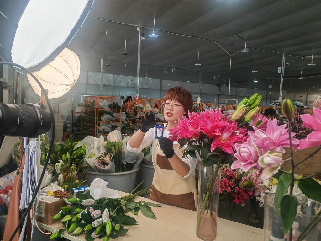 在昆明國際花卉拍賣交易中心附近,近年來新建了許多鮮花直播間,主播每天在各電商平臺(tái)直播售賣鮮花。記者在昆明夢境供應(yīng)鏈有限公司的直播基地看到,多個(gè)直播間正在售賣玫瑰、百合花等。