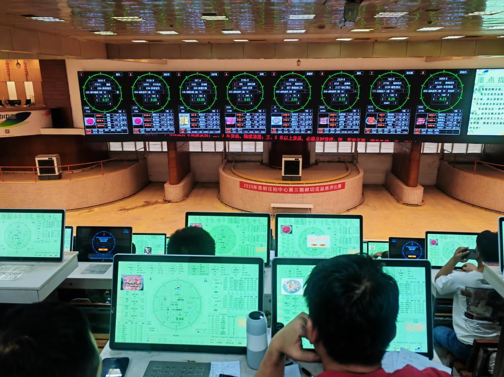 記者在昆明國際花卉拍賣交易中心看到,拍賣大鐘界面顯示著各種花卉的信息,數(shù)百名購買商操作著競價(jià)器選購鮮花。昆明國際花卉拍賣交易中心副總經(jīng)理汪洋介紹,這里每天的鮮花交易量都超700萬枝,單日最高交易量超1100萬枝,30%以上的鮮花被各大電商和直播團(tuán)隊(duì)拍下,他們再拿到電商平臺(tái)或直播間銷售。