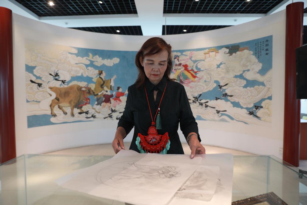 在和順,“刺繡”與“織女”亦有著巧妙的聯(lián)系。樸素的工作室內(nèi),省級(jí)非物質(zhì)文化遺產(chǎn)和順刺繡代表性傳承人范素萍正以針線“編織”牛郎織女的故事。金絲銀線在她的指尖流轉(zhuǎn),繡出鵲橋相會(huì)的動(dòng)人畫面?!昂晚樑酉騺硪源汤C為榮,就像傳說中巧手的織女?!狈端仄夹χf道。