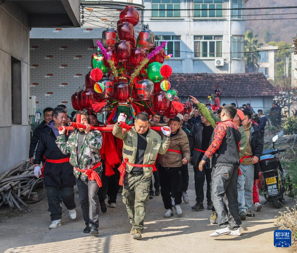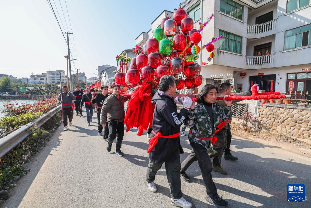 2月10日,赤松鎮(zhèn)虎巖村村民抬著板凳龍進(jìn)行巡游。