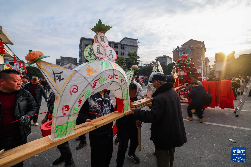 2月10日,赤松鎮(zhèn)虎巖村村民將板凳龍連接起來,準(zhǔn)備進(jìn)行晚上的巡游。