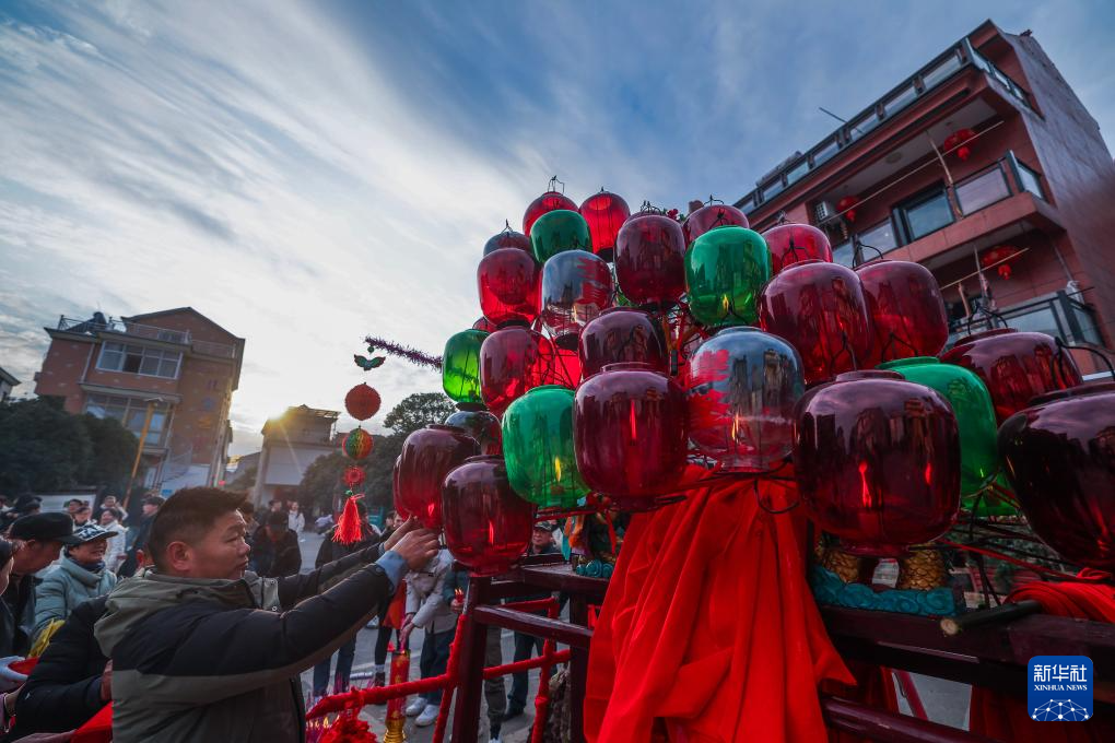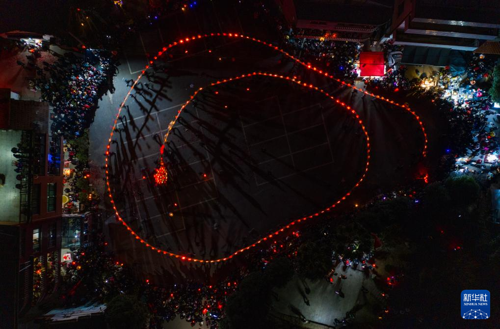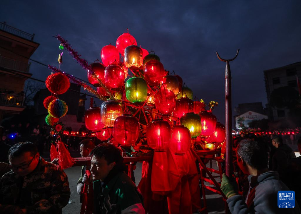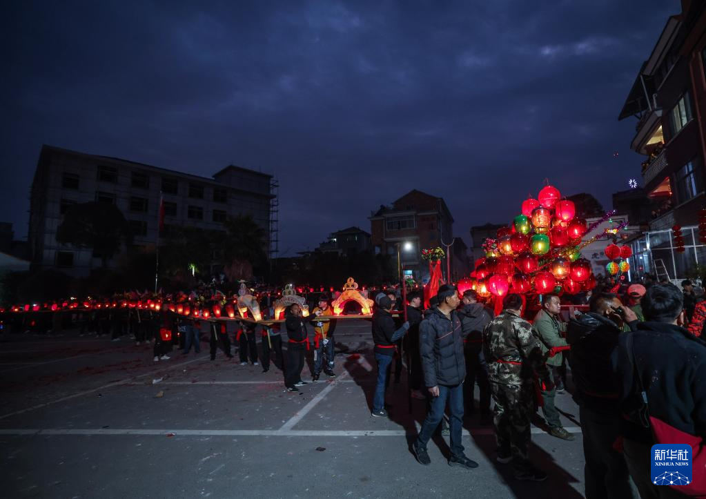 當(dāng)日是農(nóng)歷正月十三,浙江省金華市金東區(qū)赤松鎮(zhèn)虎巖村村民肩扛由100余節(jié)板凳組成的傳統(tǒng)五彩龍燈,沿村道蜿蜒游舞。板凳龍的龍頭被彩燈包裹,裝飾有花卉、祥云等圖案,在燭光搖曳間營造出“龍騰盛世”的年俗畫卷。每年元宵節(jié)前后,浙江省金華市金東區(qū)赤松鎮(zhèn)的各村村民都會(huì)舞起板凳龍燈,祈求來年風(fēng)調(diào)雨順、五谷豐登。