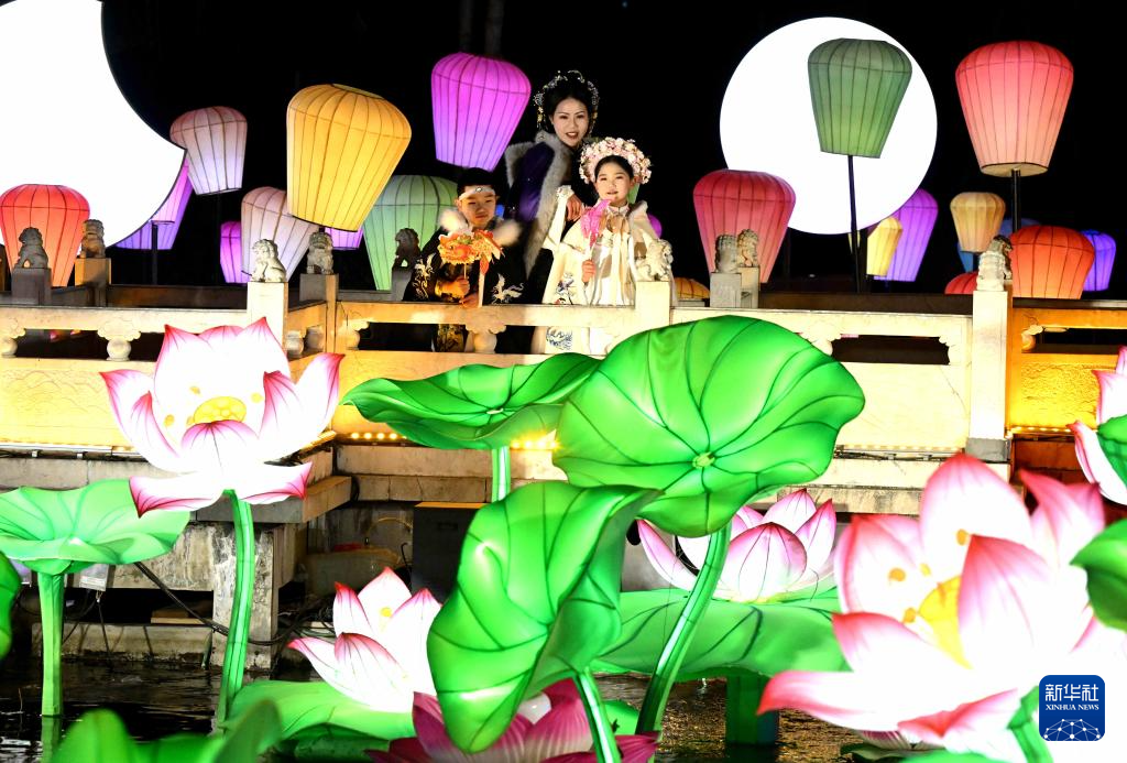 2月8日晚,身著傳統(tǒng)服飾的游人在河北省石家莊市正定榮國(guó)府影視基地內(nèi)游園賞花燈。