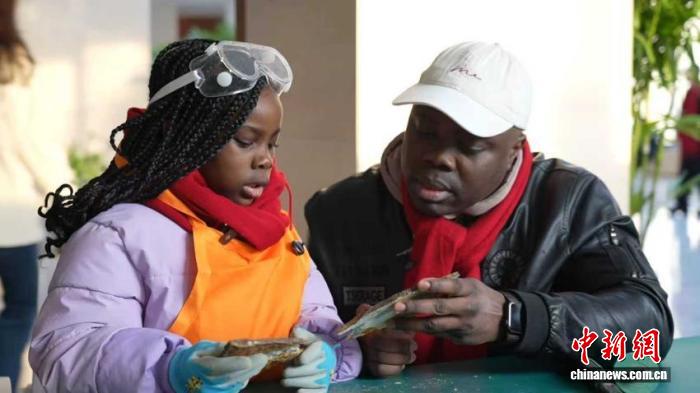 2月27日,來自尼日利亞約瑟夫(右)和女兒在遼寧朝陽鳥化石國家地質(zhì)公園化石體驗區(qū)親手“開化石”?!№n浩天 攝