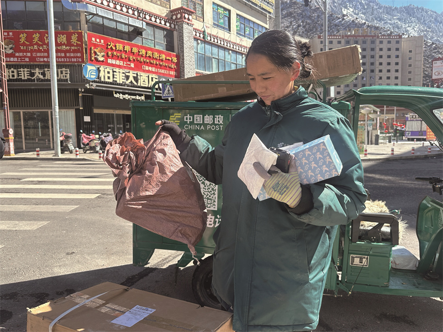 仁增曲措每日奔波在自己負(fù)責(zé)的片區(qū)分送郵政包裹。周婷婷 攝