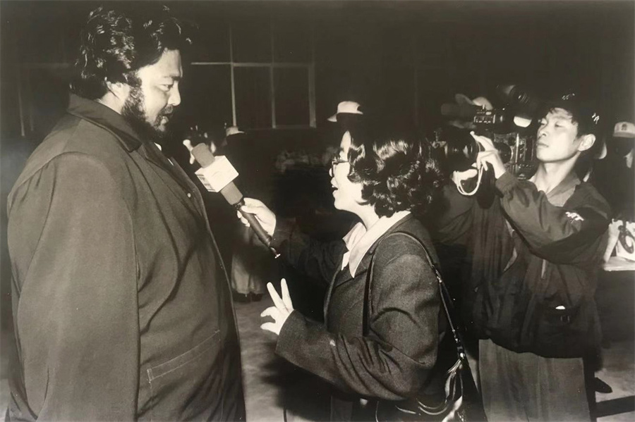1999年澤玉(左二)參加第六屆全國(guó)少數(shù)民族傳統(tǒng)體育運(yùn)動(dòng)會(huì)報(bào)道時(shí)的工作照。澤玉供圖