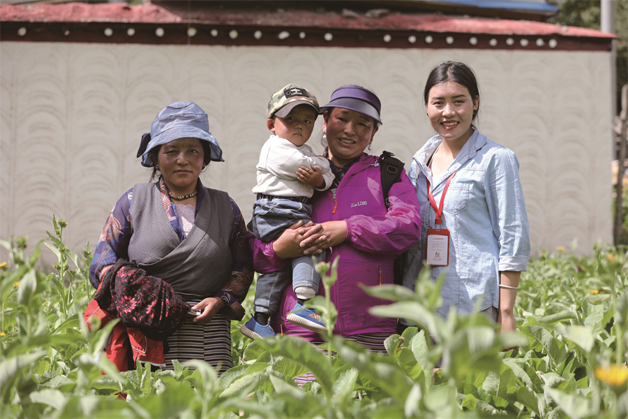 扎桑(右一)和育嬰輔導員一起入戶家訪。扎桑供圖