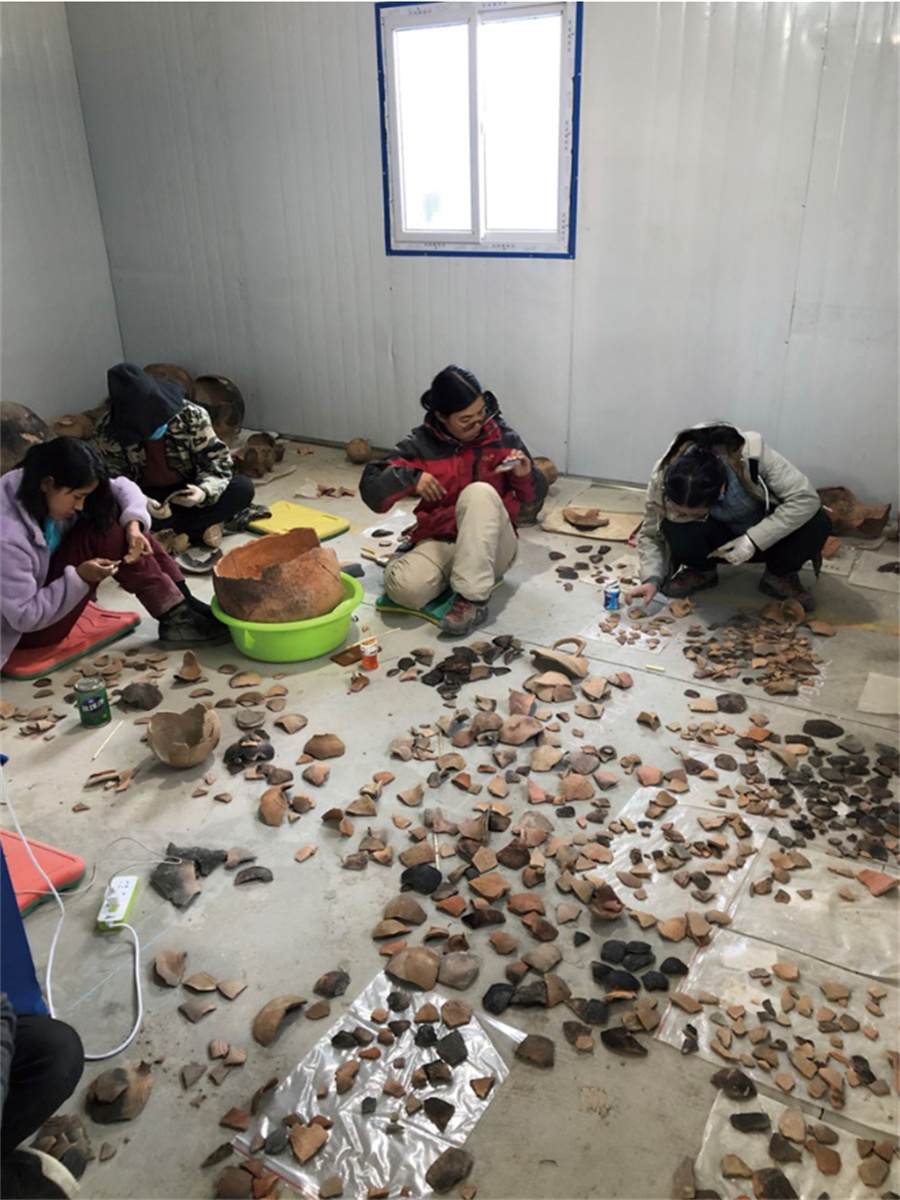 “高原女子考古隊(duì)”在桑達(dá)隆果墓地臨時(shí)庫(kù)房開(kāi)展陶器整理、拼合工作。