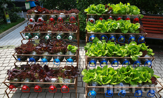 虹旭小區(qū)內(nèi),居民用礦泉水瓶再加工成為“社區(qū)瓶子菜園”。攝影:楊月云