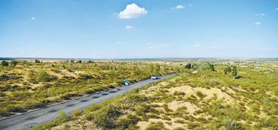 登上杭錦旗第一條穿沙公路旁的防火瞭望塔,四下遠(yuǎn)望,只見公路兩側(cè)的沙地,被沙生植物覆蓋起來。這條全長115公里的黑色柏油路,從杭錦旗錫尼鎮(zhèn)出發(fā),猶如一把利劍,直插庫布其沙漠腹地,硬生生將沙漠?dāng)r腰劈斷。