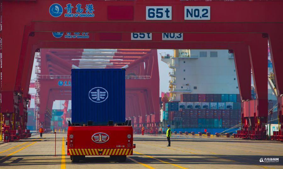 青島港全自動運(yùn)輸車行駛中。