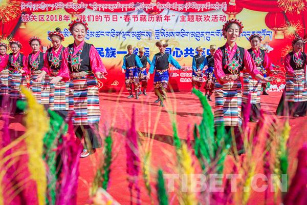 中國西藏網(wǎng)訊 2月8日上午,拉薩市城關(guān)區(qū)藏?zé)嵘鐓^(qū)張燈結(jié)彩,彩旗飄揚(yáng),2018年“我們的節(jié)日o春節(jié)藏歷新年”主題聯(lián)歡活動拉開帷幕,來自城關(guān)區(qū)的雪巴拉姆民間藝術(shù)團(tuán)、娘熱拉姆民間藝術(shù)團(tuán)、阿壩林老年文藝隊的演員們?yōu)楦髯迦罕妿砹艘粓鲆暵犑⒀纭?/p>