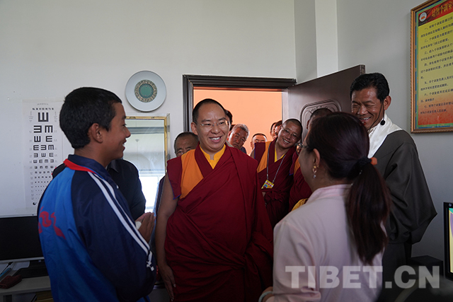 圖為十一世班禪在學(xué)??祻?fù)區(qū)與工作人員交流。攝影:王淑