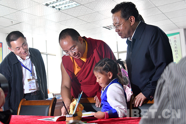 圖為十一世班禪拿起孩子們練習(xí)藏文書(shū)法的墻星(專(zhuān)用木質(zhì)寫(xiě)字板)仔細(xì)查看。攝影:王淑