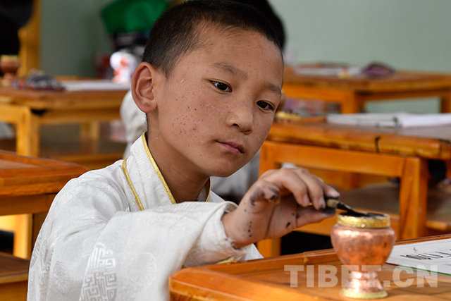 圖為藏文書(shū)法室里孩子們正在練習(xí)書(shū)法。攝影:扎西
