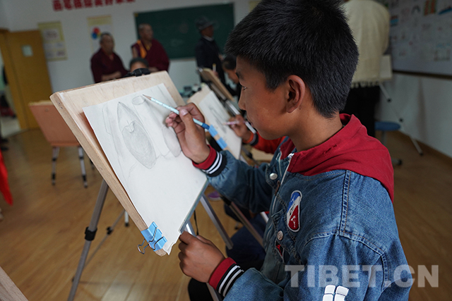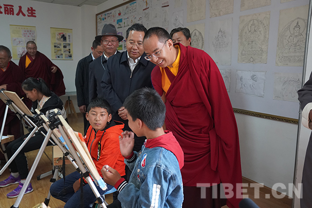 美術(shù)室里,十一世班禪與小“畫(huà)家”們交流。攝影:王淑
