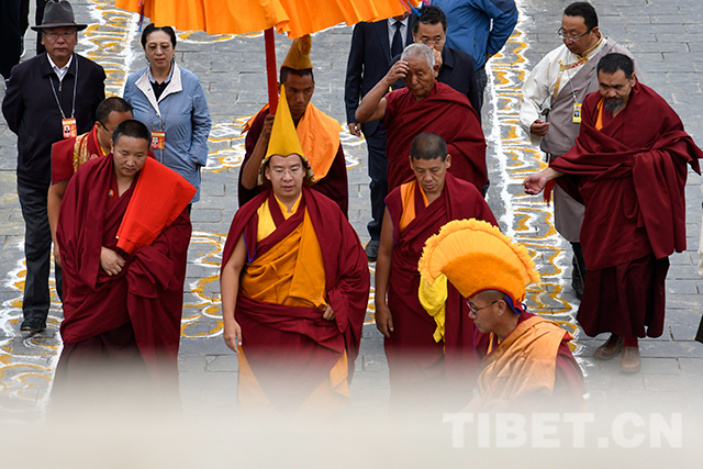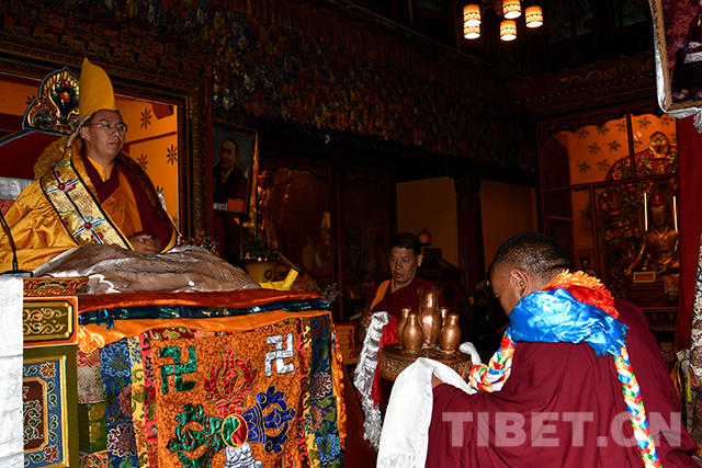 十一世班禪頭戴金色佛冠,由手持香炷的僧人引領(lǐng),緩緩步入杜康大殿。在僧人們渾厚的誦經(jīng)聲中,十一世班禪登上法座,領(lǐng)誦經(jīng)文。寺廟僧人向十一世班禪敬獻(xiàn)曼扎等,十一世班禪微笑接過(guò)后,為僧人摸頂賜福,并發(fā)放布施、供齋茶齋飯。隨后,十一世班禪朝拜珍珠唐卡殿。