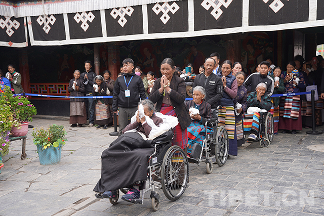 禮佛活動(dòng)結(jié)束后,十一世班禪登上設(shè)在杜康殿門(mén)前的法座,為信教群眾摸頂賜福。此時(shí),寺院外的廣場(chǎng)上,信教群眾已從四面八方趕來(lái)。隊(duì)伍里,有拄著拐杖的老人,有坐著輪椅來(lái)的老人,還有被年輕人背來(lái)的老人。