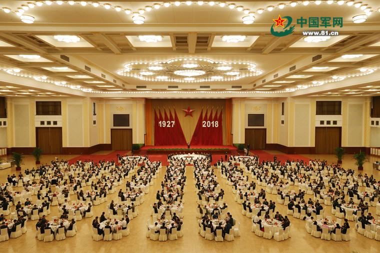 人民大會(huì)堂燈火輝煌、鮮花綻放,中外嘉賓歡聚一堂、共慶節(jié)日。主席臺(tái)帷幕中央懸掛著巨型“八一”軍徽,十面鮮艷的紅旗分立兩側(cè)?!?927—2018”醒目的大字熠熠生輝,昭示著中國(guó)人民解放軍走過(guò)了91年的光輝歲月,走進(jìn)新時(shí)代,踏上新征程。