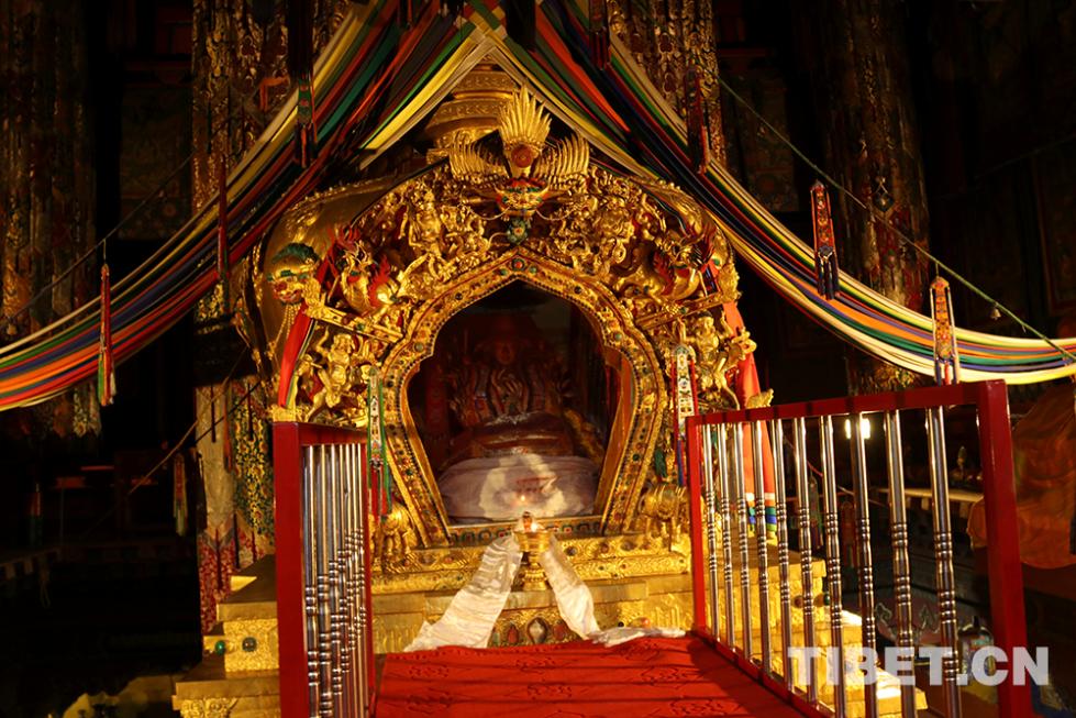 班禪大師在大金瓦殿宗喀巴銀塔前誦經(jīng)祈福。