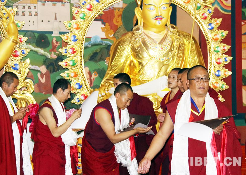 班禪帶領(lǐng)僧眾在“中華福運(yùn)輪”前念誦祈愿經(jīng)文。