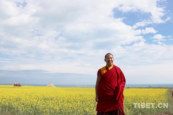 十一世班禪在青海湖邊的油菜花田邊留影。