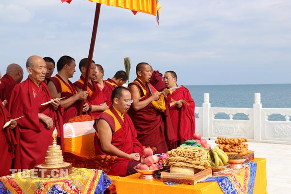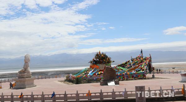 十一世班禪在青海湖邊的祭湖臺前祈福。