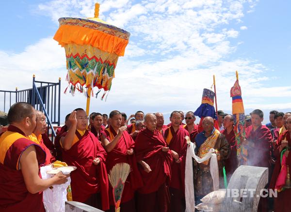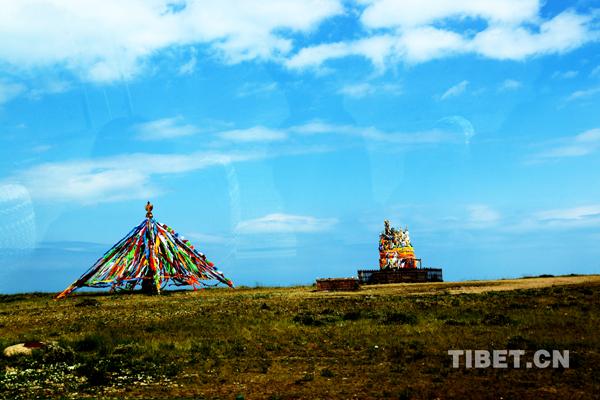 十一世班禪在茶卡鹽湖邊的敖包前誦經(jīng)祈福。
