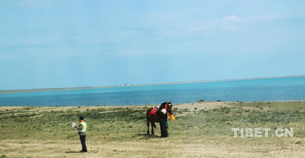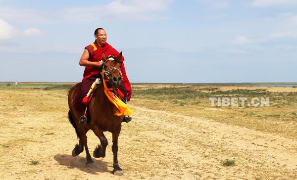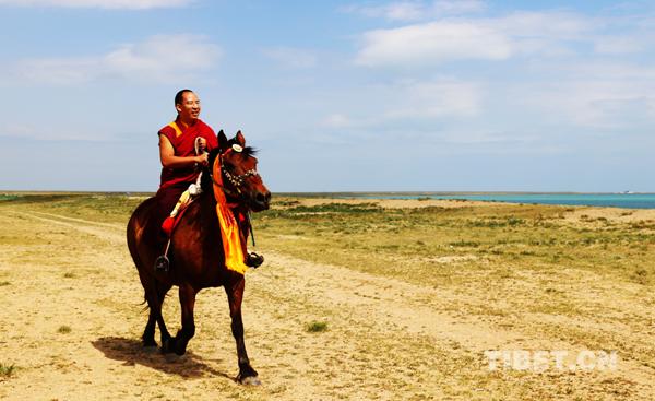 十一世班禪在青海湖邊策馬馳騁。