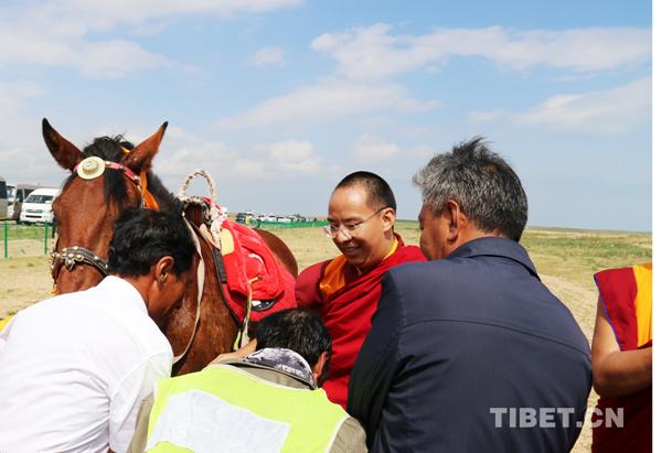 祭海儀式結(jié)束后,十一世班禪一行環(huán)湖游覽,在湖邊見到牧民斗改杰一家正牽著馬迎候。他們希望瞻禮到大師的尊容,為自己帶來福運。十一世班禪一時興起,想要騎騎他們的馬。斗改杰一家平時在青海湖二郎劍景區(qū)經(jīng)營旅游騎馬項目,沒想到今天這樣幸運,十一世班禪騎著他們的馬,在青海湖邊七月鮮花盛開的草原上,瀟灑地馳騁了幾個來回。他們激動地都說不出話了。
