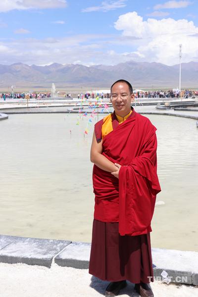 十一世班禪在茶卡鹽湖前留影。
