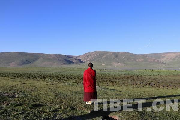 7月19日清晨,從玉樹市往西北約80公里的隆寶灘邊停下一個車隊,一位身著絳紅色僧服的年輕僧人走下車來,興致勃勃地步向隆寶灘綠油油的草甸,身后還跟著幾位著僧服的僧人。這一帶屬于玉樹州著名的隆寶灘自然保護區(qū),此時正處在一年中最好的季節(jié)。環(huán)顧四周,一望無際的高寒草甸和濕地綠油油的,像地毯一樣鋪在這片海拔4200多米的高原谷地上,遠處起伏的山脈像凝固的綠色波浪。