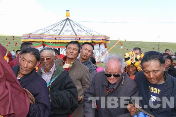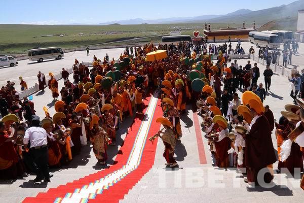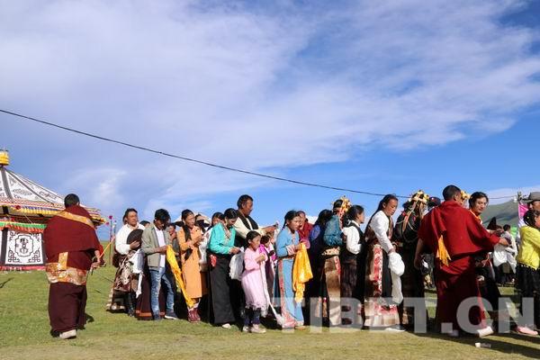 當?shù)厣兹罕娧芈氛鹃_,人們穿著錦緞藏裝,帶著豪華昂貴的藏飾,手捧哈達迎接班禪大師的到來。據(jù)了解,只有在最重要的節(jié)日和迎接貴客時,當?shù)氐娜藗儾艜@樣打扮,人們難得能見到這么高佛位的活佛,所以今天都是盛裝前來。