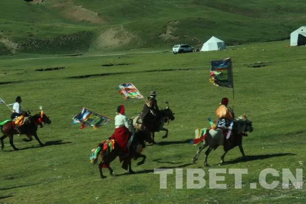 沿路上還有能歌善舞的治多人組成的舞隊,跳著豪邁的康巴舞蹈,迎接班禪大師的到來。在車隊快接近貢薩寺,抵達扎西灘草原時,激動人心的一幕出現(xiàn)了!當?shù)啬撩駛凃T著自己心愛的駿馬,組成了馬隊,按照傳統(tǒng)方式迎接班禪大師的到來,人們舉著經(jīng)幡和哈達,領隊的兩位騎士還舉著五星紅旗和黨旗?!骺蛋万T士們熱烈歡迎班禪大師蒞臨。