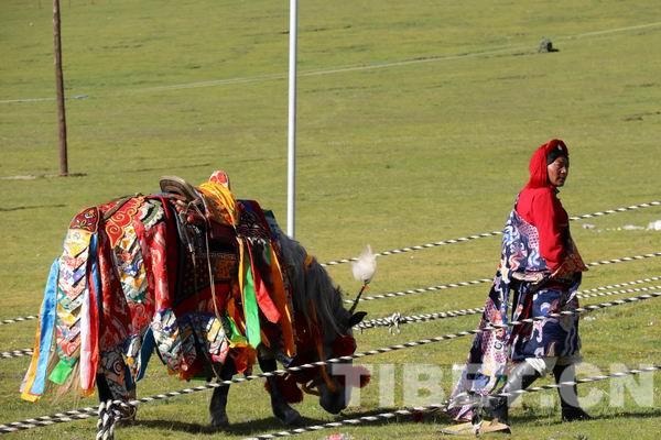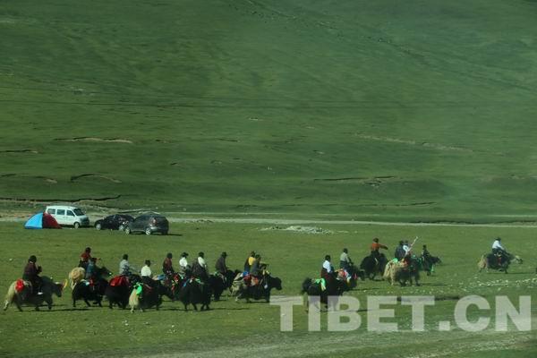 班禪大師也很激動,他站在敞篷車里,向迎接他的馬隊揮手致意,像極了他前世的樣子。馬隊的康巴騎士們看到大師的回應,激動得歡呼喝號:“格!~~嘿嘿!”除了馬隊,當?shù)厝罕娺€組成了牦牛隊,一些青少年騎著高大的牦牛奔跑在車隊兩側(cè)?!鲌D為歡迎班禪大師的牦牛隊。