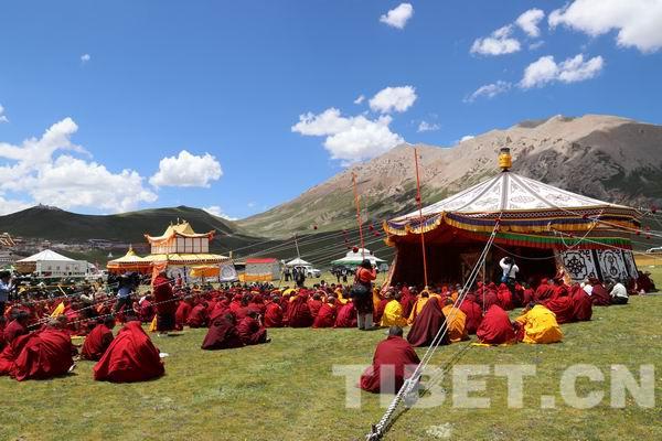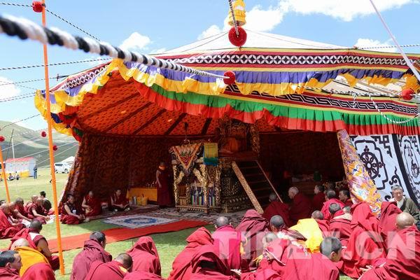 夏日草原的陽光下,班禪大師在貢薩寺準備的華帳寶座上進行講經(jīng)和灌頂,同時大師還從佛法的角度對僧人和群眾進行了遵紀守法、團結(jié)互助、積極改善生活、改正惡習、維護民族團結(jié)和社會和諧等方面的教誨。△班禪大師在寶帳中的法座上講法。